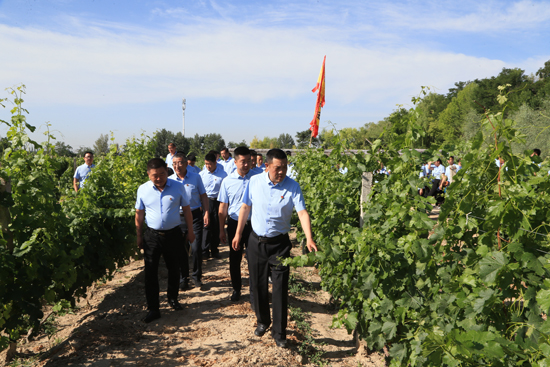 為了深入落實(shí)習(xí)近平總書記對(duì)寧夏賀蘭山東麓葡萄酒產(chǎn)業(yè)發(fā)展的指示精神,銀川城建集團(tuán)黨委書記、董事長(zhǎng)雷光新帶領(lǐng)全體黨員走進(jìn)賀蘭山東麓新牛酒莊葡萄種植園考察,大力促進(jìn)葡萄酒事業(yè)發(fā)展。