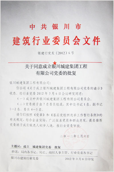 銀川市建筑行業(yè)黨委的批復(fù)